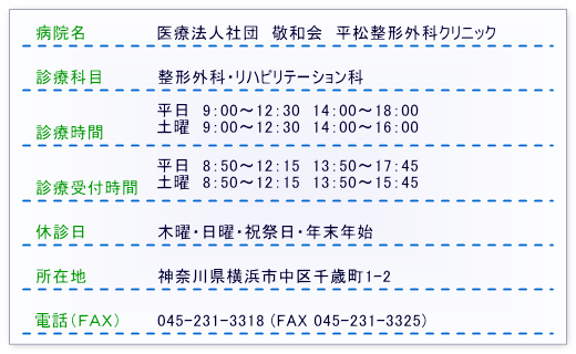 JR「関内」駅、「石川町」駅より共に徒歩12分、横浜市営地下鉄「伊勢佐木長者町」駅から徒歩5分の平松整形外科クリニック
